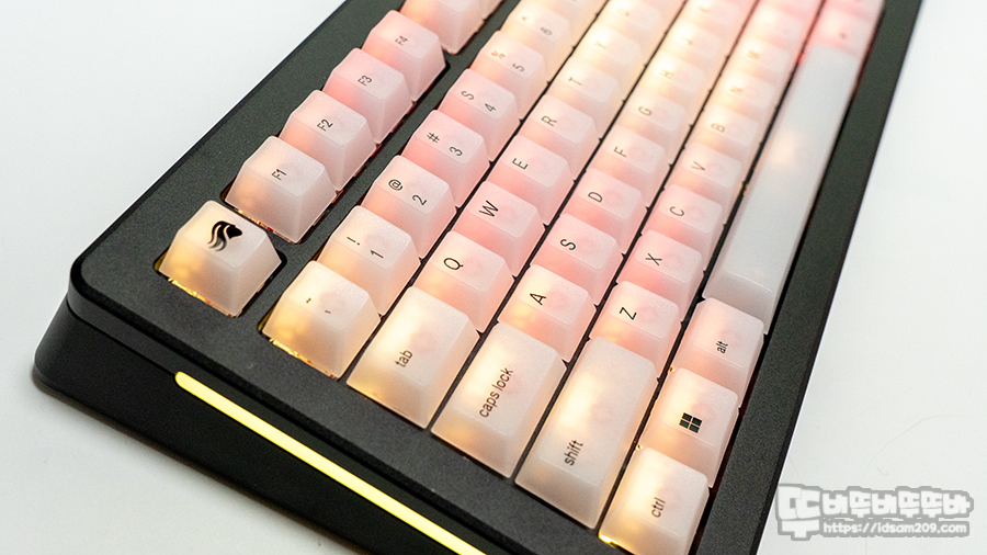폴리카보네이트는 키보드 보강판으로 많이 사용되었지만 요즘은 키캡으로도 적용되면서 반투명 느낌에 은은하게 퍼지는 글로우 효과로 쨍하게 표현되는 투명 키캡보다 RGB LED 발색면에서 좋은 느낌을 주며 반투명 소재 특성상 스위치의 스템 컬러가 보이는 것을 확인할 수 있습니다.