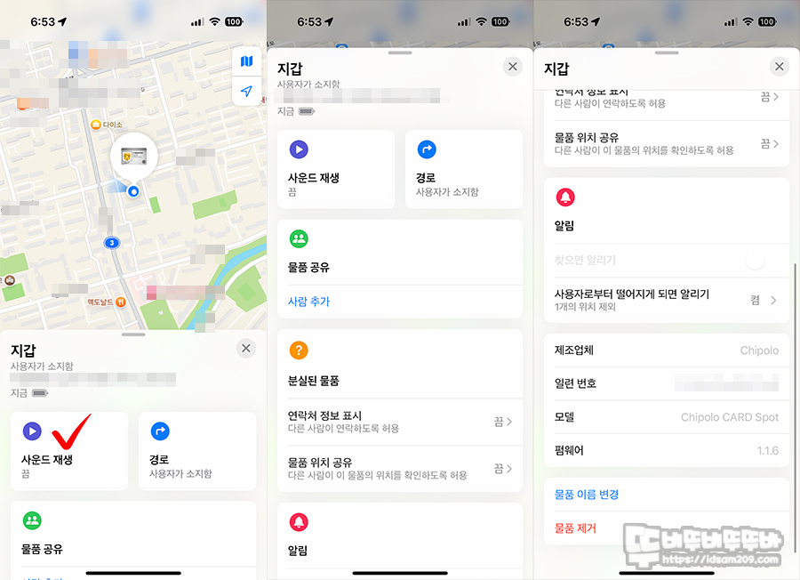 앱에서는 실시간 위치 확인이 가능하며, 필요시 사운드 재생 버튼을 눌러 카드에서 들리는 큰 소리로 위치를 추적할 수 있고요.