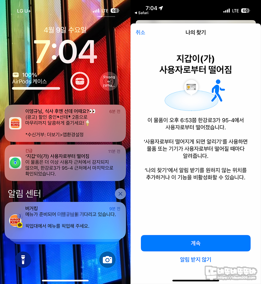 이날은 영화 "아마추어" 관람하기 위해 용산 CGV를 방문하여 지인과 영화 상영 전 저녁을 먹으면서 잠시 화장실을 갔는데 빠르게 거리 이탈 알림을 보내주며 분실 위험을 인지할 수 있었습니다.