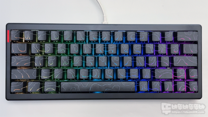 보강판에 부착되는 체리방식의 스빌라이저 또한 안정적인 키보드 빌드의 한 축을 담당하고 있으며 체리 프로파일의 PBT 이중사출 키캡은 꽤 두툼한 편이며 3D 키캡이라 언급한 것과 같이 측각 부분도 레이저 각인이 아니 사출로 제작되어 정방향 키캡의 LED 라이팅을 잘 표현합니다.