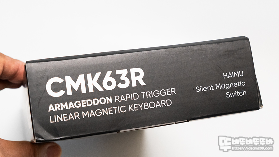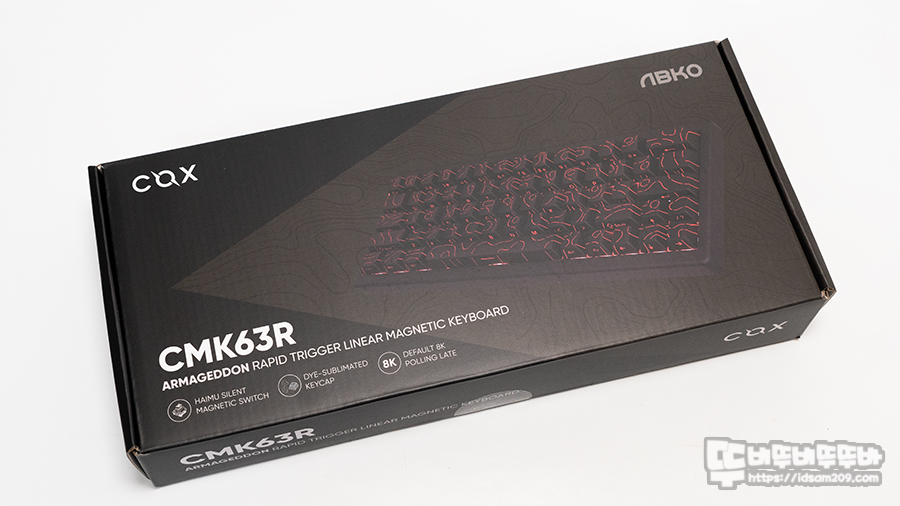 패키지는 레드 컬러 백라이트의 등고선 이미지가 꽤 인적으로 표현되어 있는데 CMK63R 모델명과 아마겟돈 에디션 강조, HAIMU 저소음 자석축, PBT 이중사출 키캡, 디폴트 8K 폴링 레이트 등의 정보로 제품의 특징을 어느 정도 확인할 수 있습니다.