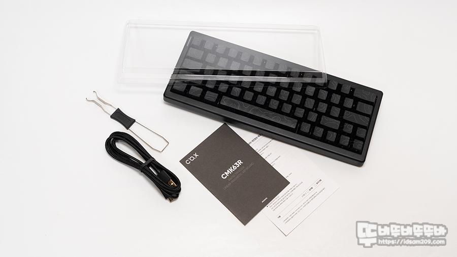 제품은 키보드 본체, 투명 더스트 커버, USB-A to C 케이블, 키캡&스위치 리무버, 사용 설명서로 구성되어 있습니다.