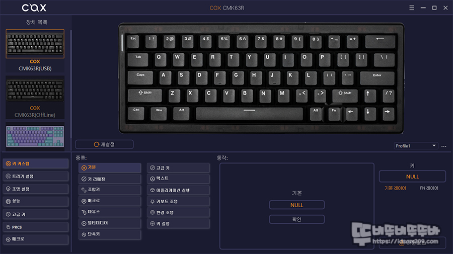 스페이스바 오른쪽에 Alt, Fn 키로 구성된 제품의 경우 오른쪽 Ctrl 키가 없기에 Fn + 오른쪽 Alt 키 조합으로 사용하게 기본으로 설정해 주면 좋은 몇몇 브랜드를 제외하고는 대부분 설정이 없는 상태로 판매를 하고 있는데 COX CMK63R 아마겟돈 에디션 또한 이런 설정이 없이 판매되고 있어 키보드에 전문 지식이 없는 분들은 많이 난감하게 됩니다.