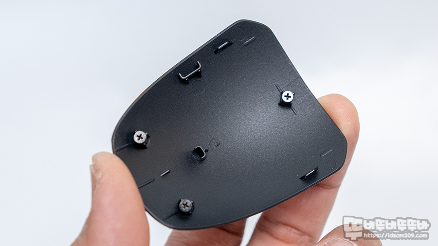 마우스의 로고가 있는 상판 부분은 탈부착이 가능한 커버로 디자인되어 베이스에는 네오디뮴 자석 내장 그리고 커버 안쪽에는 납작한 나사를 사용하여 고정하는 커버가 사용된 일반적인 제품과 비슷한 모습을 확인할 수 있습니다.