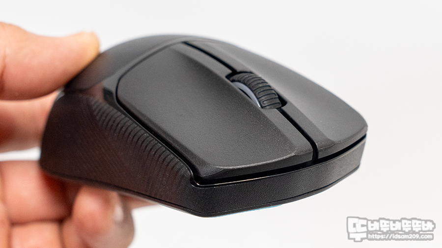 마우스의 전체적인 쉐입은 중앙 부분이 완만한 라운드 형태로 마우스 그립 시 팜 그립이 어색하지 않고 편안하게 그립이 가능하며 사이드 표면에는 미세한 사각형을 라인으로 배치하는 마이크로 라인 텍스처로 디자인되어 마우스 그립 시 미끄러지 않고 딱 부착되는 느낌을 줍니다.