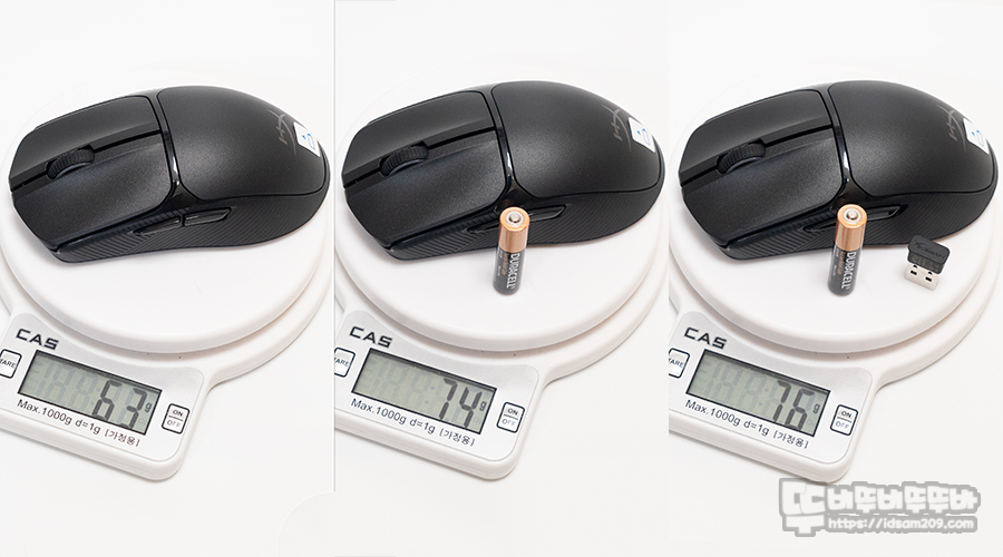 스펙상 무게를 확인하기 위하여 1g 단위로 측정 가능한 디지털 저울로 무게를 측정해 보면 건전지와 무선 리시버를 제외한 무게 63g, AAA 건전지 추가 시 74g, 무선 리시버 추가 시 76g 순의 무게를 확인할 수 있습니다.