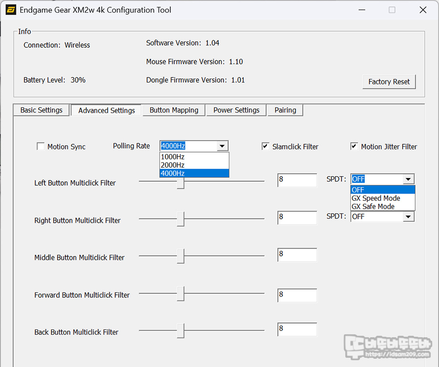 그 외 마우스를 쾅하고 내려치는 충격 시 눌리는 오류를 방지하는 슬램클릭 필터, 모션 지터 필터, 그리고 GX 스위치에서만 사용할 수 있는 SPDT 옵션을 지원하고 있습니다.