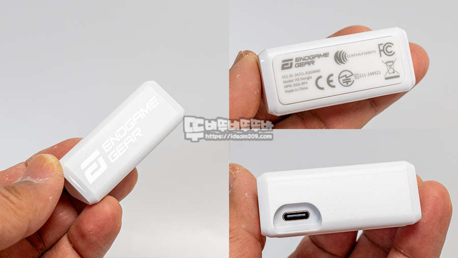삼각 프리즘 형태로 USB-C 단자가 내장된 케이블 연결부, 전면에는 로고와 엔드게이기어 음각 각인, 바닥면에는 실리콘 재질의 미끄럼 방지 패드가 부착된 4K 무선 리시버를 제공하여 1K, 2K, 4K 성능으로 사용이 가능합니다.