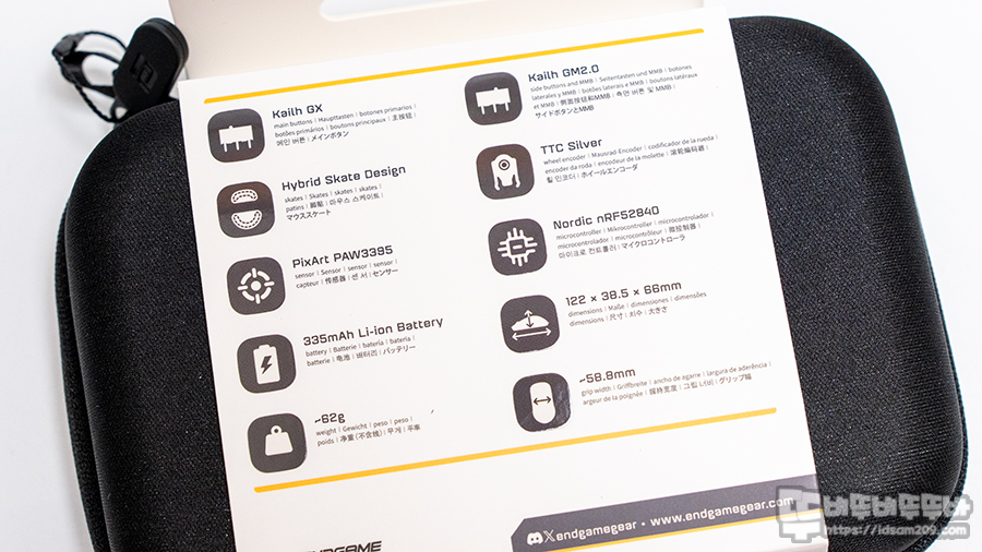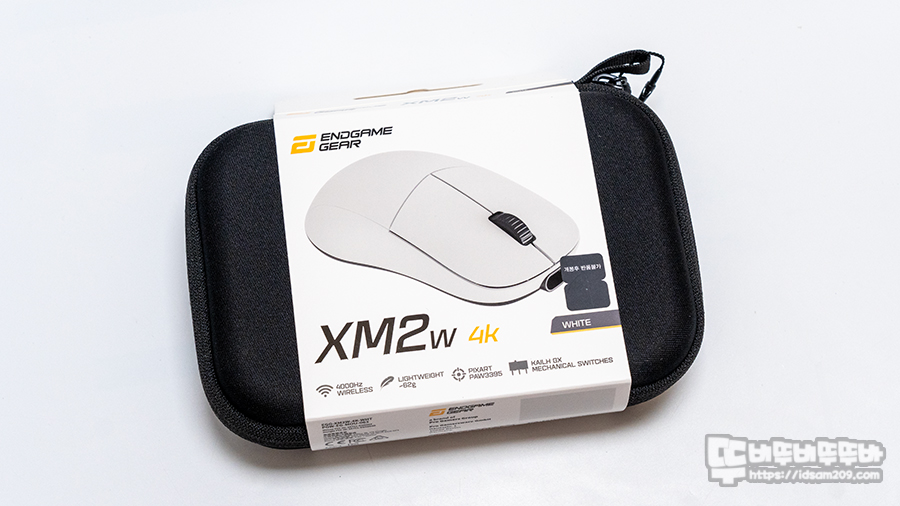 Endgame Gear XM2w 4K 무선 게이밍 마우스 패키지는 기존의 박스 패키지와 다르게 하드 케이스와 스펙 정보가 인쇄된 띠지로 구성되어 있습니다.