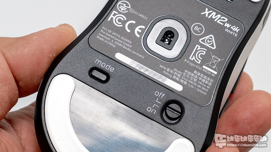 바닥면에는 Mode 버튼과 전원 On/Off 버튼으로 구성되어 있는데 Mode 버튼은 짧게는 CPI(DPI) 단계를 선택할 수 있으며 길게 눌러 Hz 선택이 가능한데 선택된 CPI 상태에서 1.5초 길게 눌러주면 1회 점멸 1000Hz, 2회 점멸 2000Hz, 4회 점멸 4000Hz로 선택이 가능합니다.