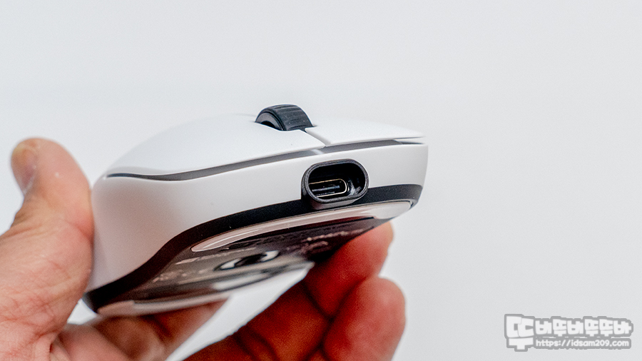 마우스 전면에는 충전과 유선 사용을 지원하는 USB-C 단자를 확인할 수 있습니다.