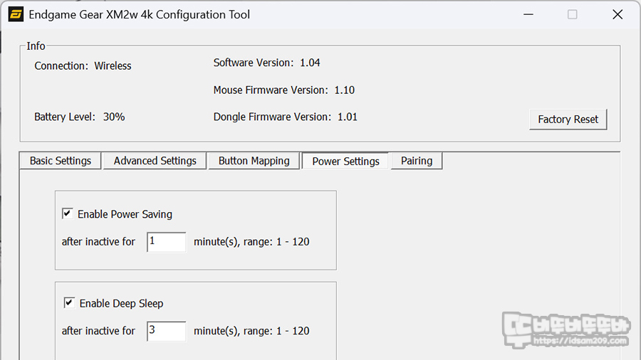 파워 세팅에서는 마우스를 사용하다가 일정 시간 입력이 없을 때 성능을 살짝 낮추는 파워 세이빙 모드와 장시간 사용하지 않을 때 배터리 소모를 막기 위해 작동하는 딥 슬립 모드는 모두 1~120분 사이 시간을 설정할 수 있습니다.