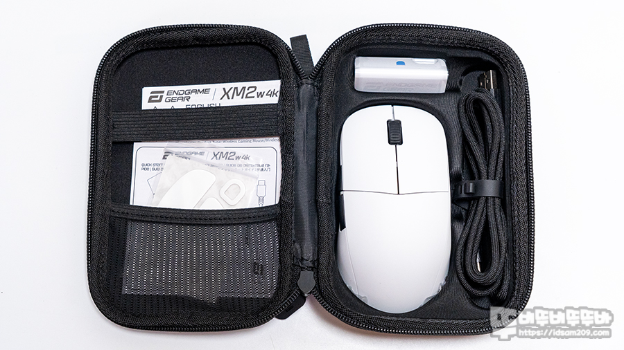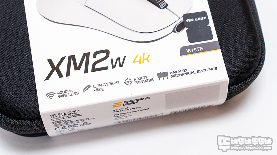 Endgame Gear XM2w 4K 무선 게이밍 마우스 패키지는 기존의 박스 패키지와 다르게 하드 케이스와 스펙 정보가 인쇄된 띠지로 구성되어 있습니다.