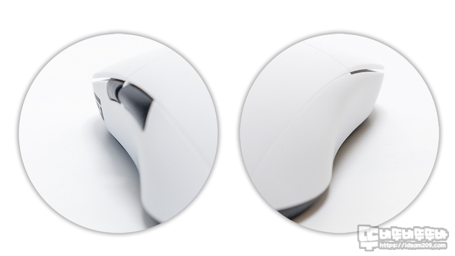 360도 모습을 살펴보면 마우스 상단 등 부분이 낮게 디자인되어 팜, 클로 그립에 최적화되었으며 버튼이 넓은 편이라 개인적으로 맘에 드는데 지인들 중에는 마우스 그립 시 약지 손가락이 오른쪽 버튼 사이드 부분에 닿아 불편하다고 이야기하곤 하는데 아마도 좌우 폭이 넓은 마우스를 사용할 때 생각보다 손가락을 많이 벌려야 하기에 발생하는 문제가 아닌가 하는 생각이...