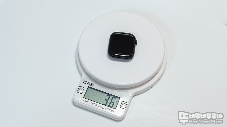 애플워치10 46mm 제트블랙는 약 36g으로 가벼워 보이지만 스포츠밴드 결합 후 손목에 착용하면 은근 무게가 나가는 편입니다.