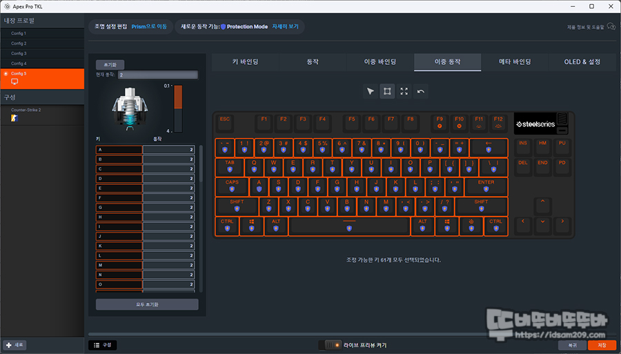 보통 DKS 기능이라고 하여 한개 키를 눌렀을 때 다양한 키 기능이 입력되는 기능을 지원하는 기능 중에서 스틸시리즈 GG에서는 이중 바인딩으로 키 입력 지점을 이중 동작에서 설정하고 이중 바인딩에서 입력을 원하는 키를 설정하면 누르고 떼는 반응으로 2가지 키 입력이 가능합니다.