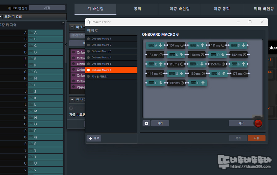 키를 마우스로 선택하여 나오는 기능 중 매크로 기능을 선택 시 다양한 매크로를 기록하여 활용이 가능하며 하드웨어 방식으로 입력된 매크로 정보도 확인 및 수정이 가능합니다.