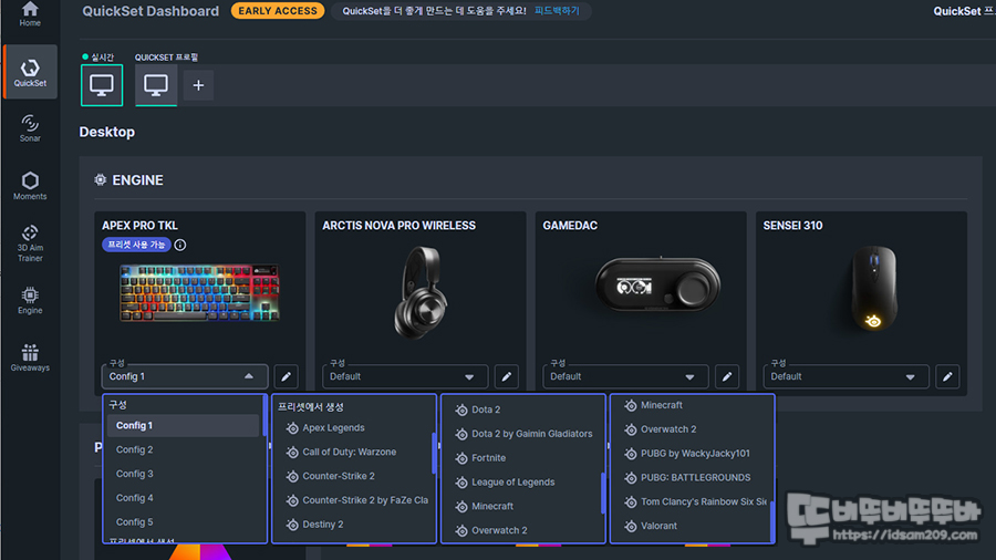 Steelseries GG는 브랜드의 제품을 모두 통합하는 소프트웨어로 기기의 메뉴 담당하는 엔진 이외 게이밍 설정을 빠르게 할 수 있는 퀵셋과 사운드 관련 소나, 게임 화면 캡처를 기록하는 모멘트, 게임의 퍼포먼스 향상을 위한 3D Aim 트레이너 메뉴로 구성되어 알차게 사용할 수 있습니다.