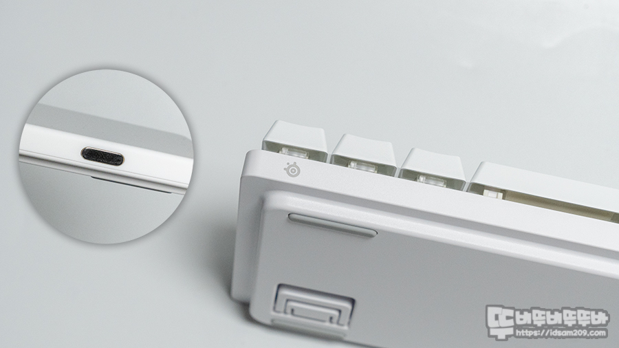 조금 독특하게 USB-C 단자가 있는 키보드 상단부에 스틸시리즈 영문 로고가 위치하고 있으며 키보드 전면에는 그냥 로고 모습을 제품의 아이덴티티를 표현하고 있고요.