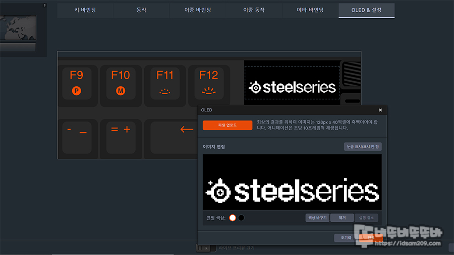 마지막으로 OLED 설정에는 128 x 40 픽셀 해상도의 이미지 또는 GIF 애니메이션(10프레임) 파일을 업로드하여 OLED 화면에 띄울 수 있는데 테스트해 보니 128 x 20 픽셀 정도되는 해상도로 작업하여야 기능키 표현 부분과 겹치지 않으니 참고하세요.