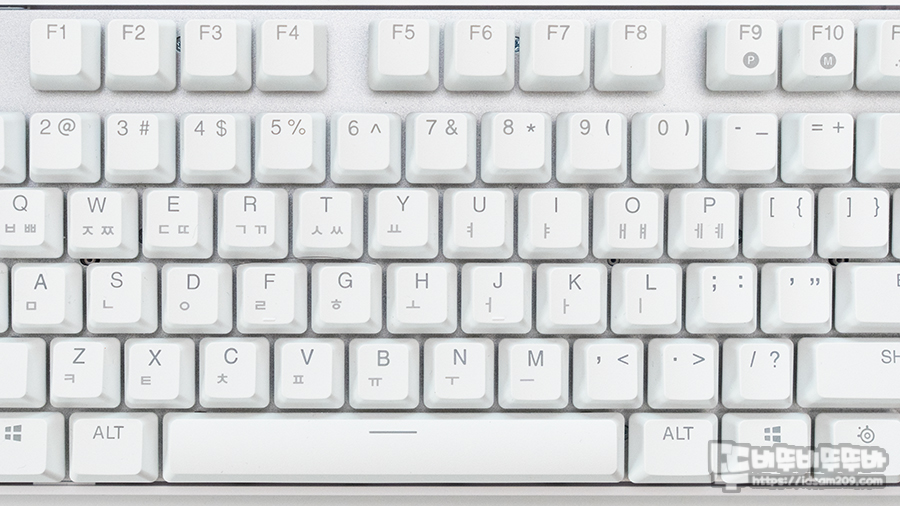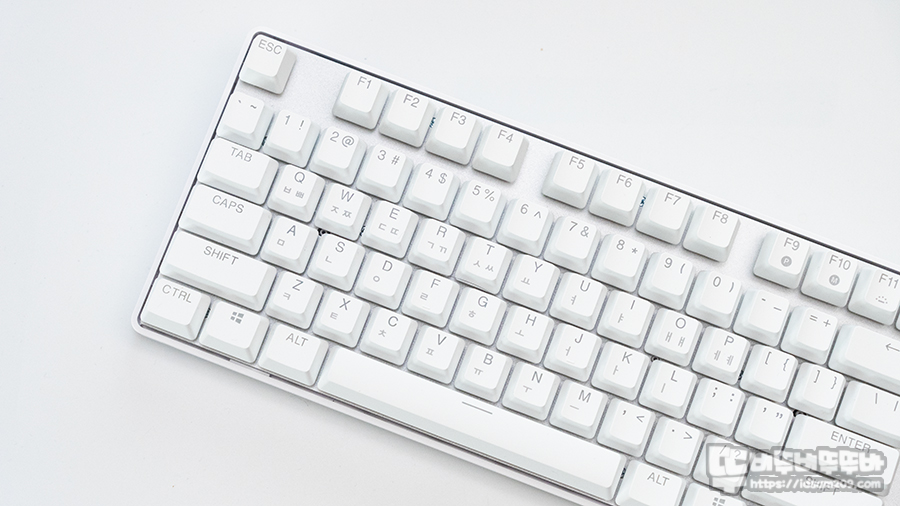 화이트 컬러와 PBT 재질의 조화라 그런지 키캡 표면이 뽀송뽀송한게 오랜 시간 타이핑해도 새거 같은 느낌을 주네요.