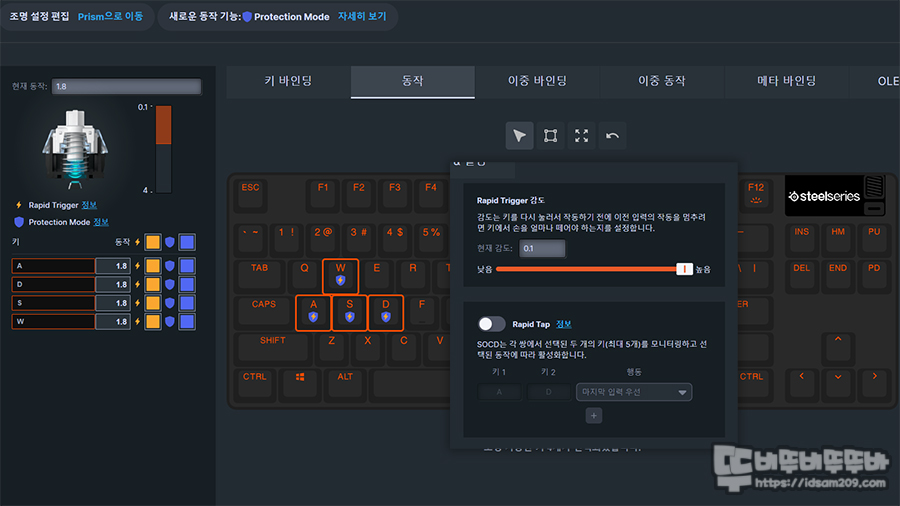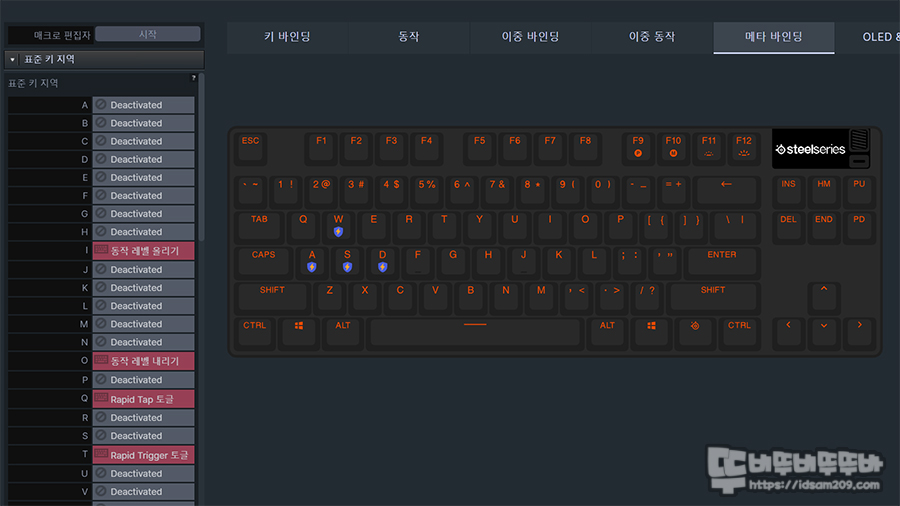 보통 DKS 기능이라고 하여 한개 키를 눌렀을 때 다양한 키 기능이 입력되는 기능을 지원하는 기능 중에서 스틸시리즈 GG에서는 이중 바인딩으로 키 입력 지점을 이중 동작에서 설정하고 이중 바인딩에서 입력을 원하는 키를 설정하면 누르고 떼는 반응으로 2가지 키 입력이 가능합니다.