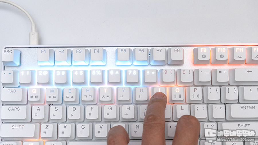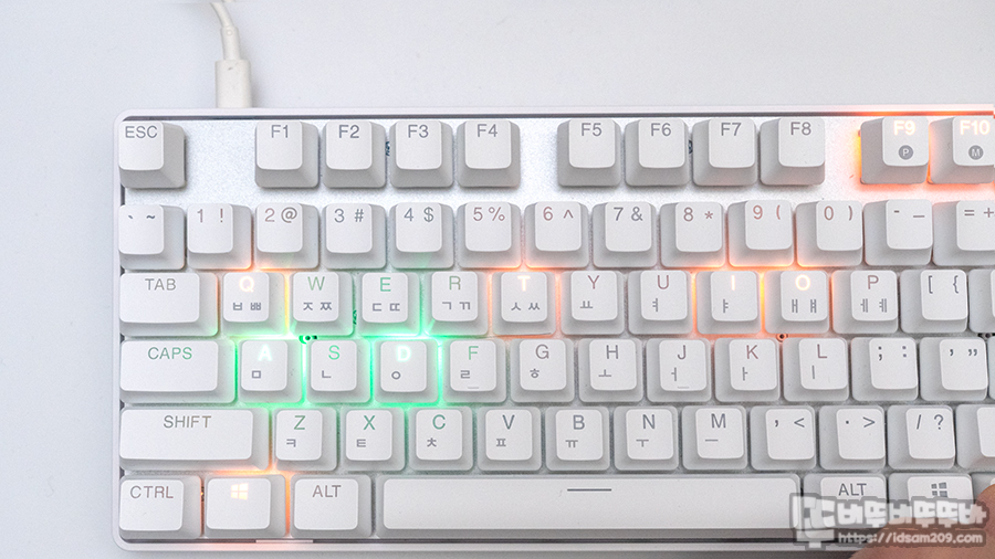 PBT 이중사출로 제작된 키캡은 빛이 투과되는 영문 각인과 레이저 각인으로 처리된 한글 각인을 확인할 수 있으며 역방향 구조지만 생각보다 RGB LED 투과가 잘되어 광량이 밝은 편입니다.
