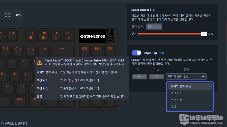 다만 한 가지! 소프트웨어 안내와 같이 ‘래피드 탭’ 기능은 카운터 스트라이크 2에서는 금지된 기능이니 해당 게임에서는 꼭 비활성화해야 하니 꼭 참고하세요.