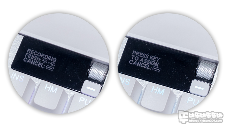 FN + F10으로 사용하게 되는 매크로 기능을 활성화하면 레코딩을 알려주는 RED LED 점등되며 키입력 후 FN + F10키를 눌러주면 입력이 종료되면서 매크로 기능을 저장할 키를 선택하라는 메시지가 디스플레이 표시됩니다.