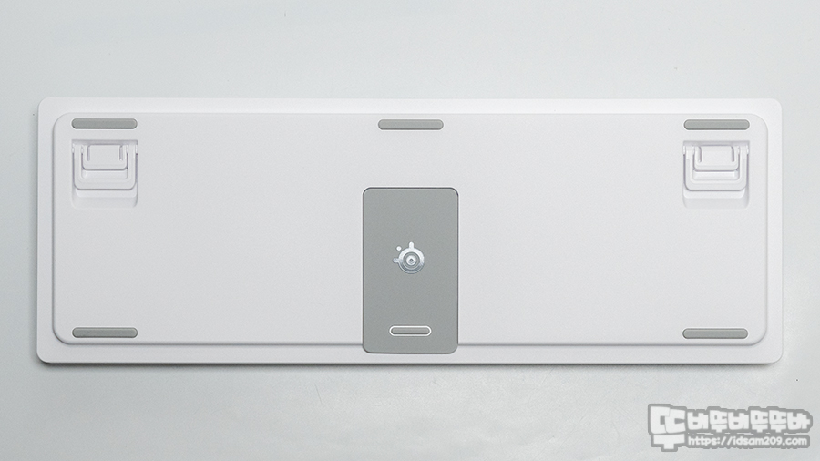 조금 독특하게 USB-C 단자가 있는 키보드 상단부에 스틸시리즈 영문 로고가 위치하고 있으며 키보드 전면에는 그냥 로고 모습을 제품의 아이덴티티를 표현하고 있고요.