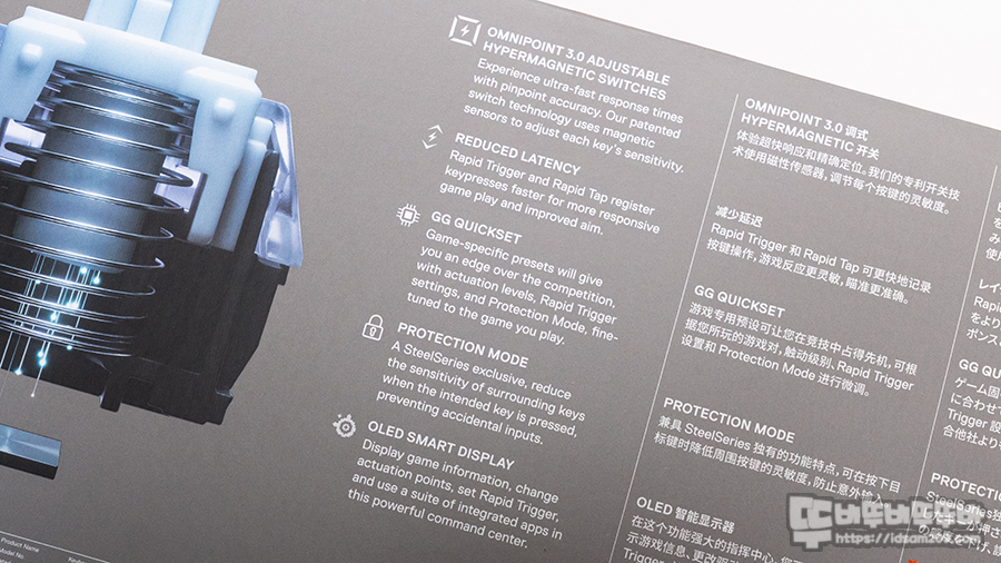 먼저 OmniPoint 3.0 자석 스위치를 기반으로 0.1~0.4mm까지 미세한 작동 포인트 설정이 가능하고, 일반 기계식 스위치 대비 20배 빠른 반응속도, 11배 빠른 입력 응답, 2배 향상된 내구성을 자랑합니다.