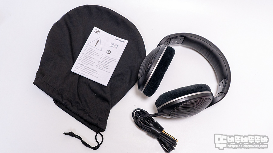 패키지를 오픈하면 파우치에 담겨있는 헤드폰의 모습을 확인할 수 있으며 제품은 파우치, 간단 안내서, HD550 헤드폰과 케이블을 확인할 수 있습니다.
