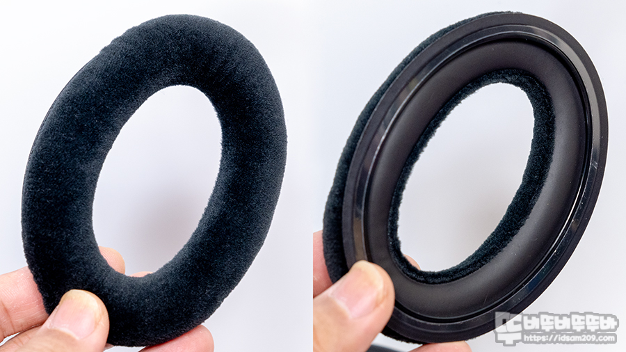 벨 소재가 사용된 이어패드는 탈부착이 가능하며 착용 시 부드러운 느낌이 좋고 쿠션감이 있어 장시간 착용 시 귀를 누르는 압력도 느껴지지 않았지만 계절적 영향으로 며칠 덥고 습한 상황에서 헤드폰 착용 시 열기로 인한 축축함은 피할 수 없으니 참고하세요.