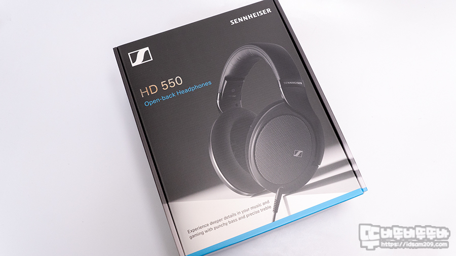 패키지에는 젠하이저 로고와 모델명 HD 550 오픈백 헤드폰이라는 문구로 제품의 성향을 표현하고 있으며 하단에는 강렬한 저음과 정확한 고음으로 음악과 게임에서 더욱 깊은 디테일을 경험하는 내용을 더하고 있네요.