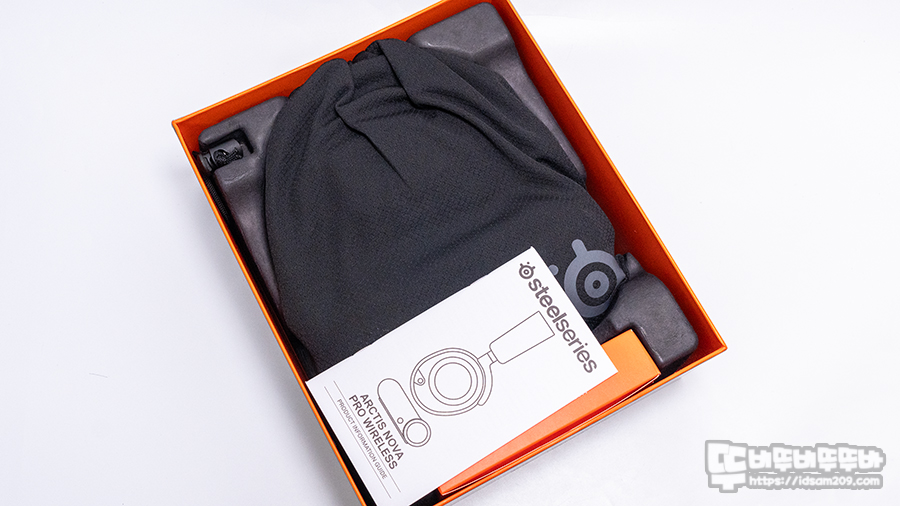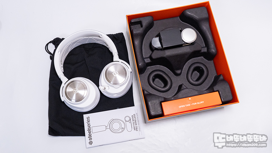 패키지를 개봉하면 파우치에 담긴 헤드셋과 뉴얼을 확인할 수 있으며 헤드셋을 들어냈을 때 베이스 스테이션과 케이블이 담긴 작은 박스를 보게 됩니다.