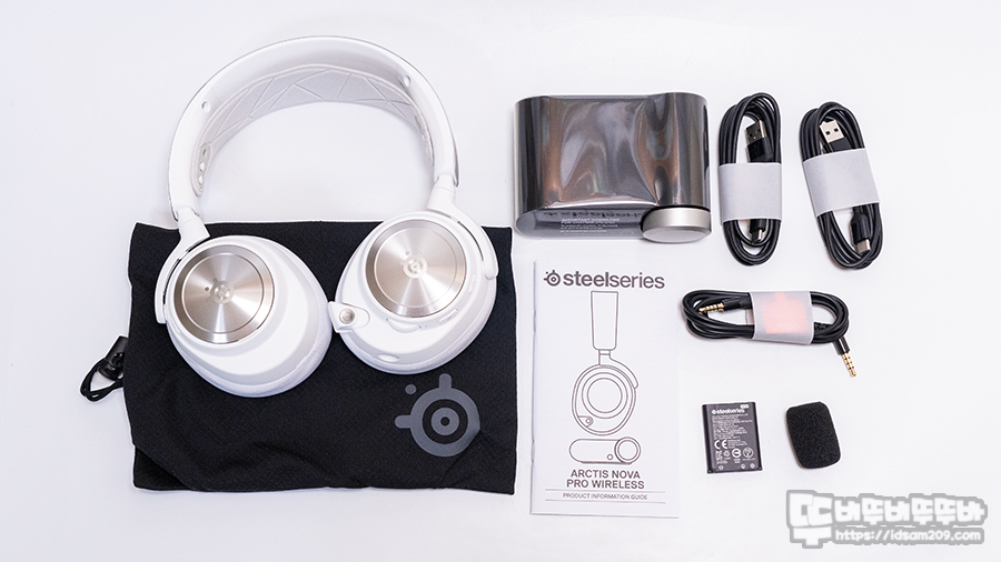 제품은 스틸시리즈 Steelseries Arctis NOVA Pro 본체(배터리 1개 내장), 파우치, GameDAC Gen2 베이스 스테이션, USB-C to A 케이블 2개, 유선 케이블, 배터리 1개, 마이크용 윈드커버 그리고 사용 설명서로 구성되어 있습니다.