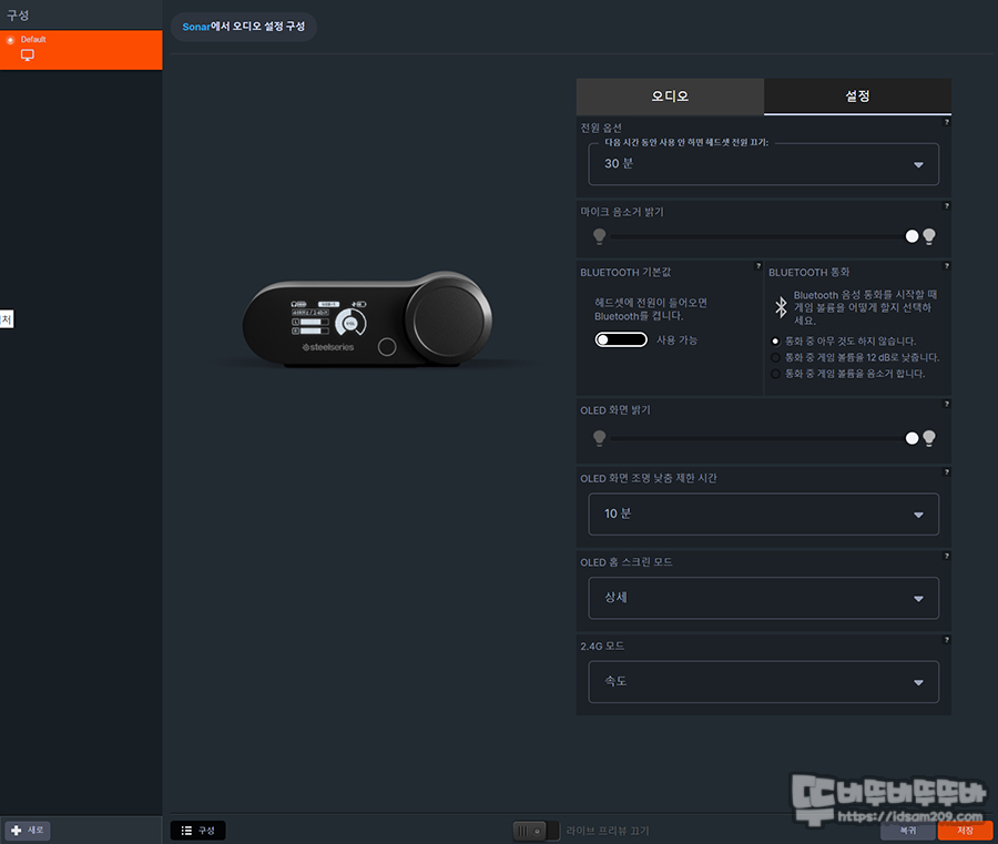 그 외 엔진 메뉴에서는 소나를 사용하지 않을 때 설정할 수 있는 EQ 설정, 사전 설정을 통해 프리셋 설정, 마이크 설정 그리고 대기 모드 설정, 마이크 사용 시 LED 밝기, 블루투스 연결 설정, OLED 밝기, 2.4G 모드 시 속도 또는 범위 설정 등 헤드셋에 대한 설정을 할 수 있으니 참고하시기 바랍니다.