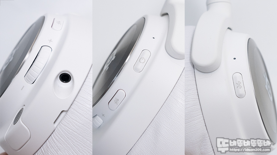 헤드셋 왼쪽 하우징에는 수납형으로 사용되는 마이크, 유션 연결 단자, 볼륨 노브와 마이크 On/Off 버튼 그리고 전원 버튼과 LED 인디케이터로 구성되어 있으며 오른쪽 하우징에는 블루투스 On/Off 버튼과 LED 인디케이터로 구성되어 있있으며 버튼 기능은 다음과 같습니다.