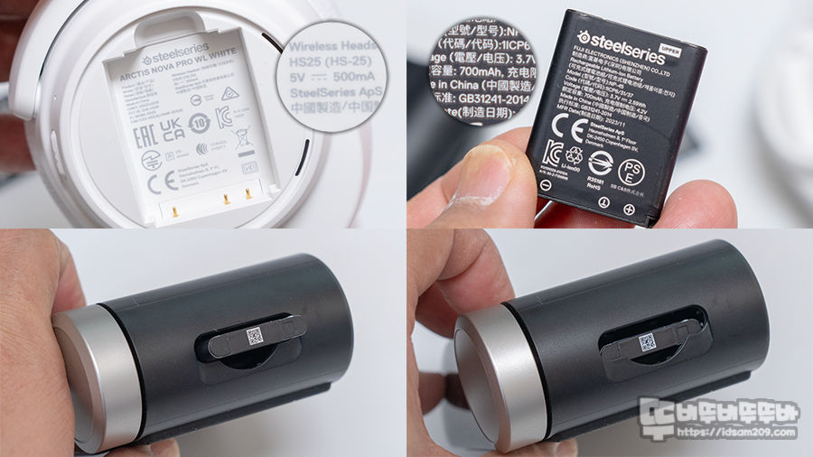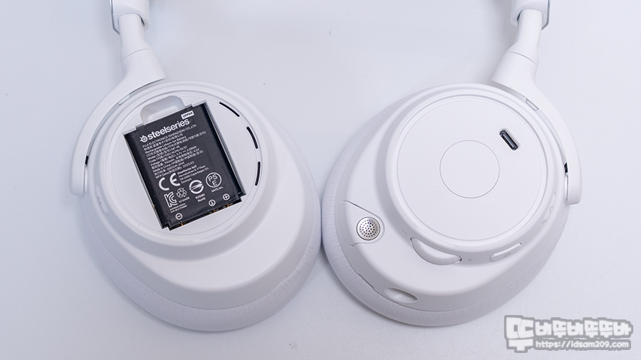 헤드셋의 오른쪽에는 700mAh 배터리가 기본 장착되어 있으며, 왼쪽에는 USB-C 단자가 있어 베이스 스테이션을 이용한 배터리 충전, USB-C를 직접 연결하여 충전하는 방식으로 사용이 가능하지만 배터리 교체가 빠르게 좋아 직접 충전은 잘 사용하지 않게 됩니다.