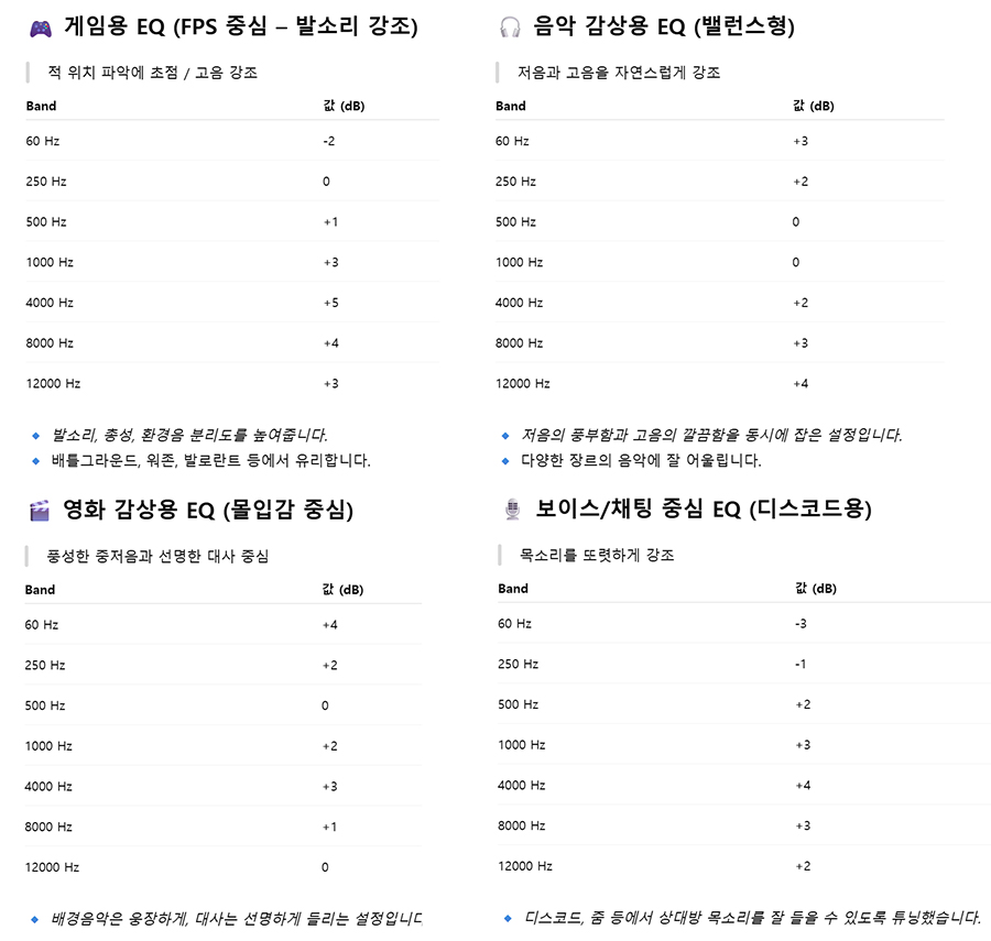 사운드 부분에서도 게임에 특화된 다양한 프리셋이 기본으로 제공되고 있지만 ChatGPT의 도움을 받으면 나름 도움이 되는 EQ 설정값 도움을 받을 수 있으니 잘 활용하시면 좋을 거 같습니다.
