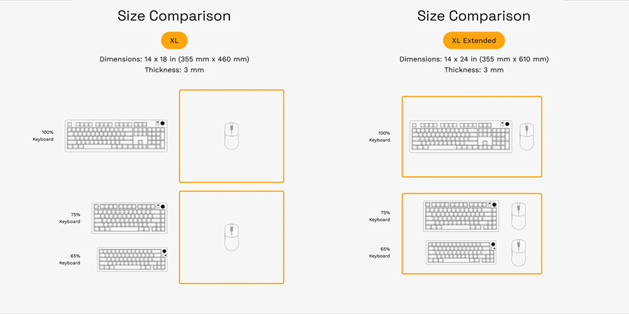 제조사 홈페이지의 정보를 살펴보면 100%, 75%, 65% 사이즈의 키보드를 기준으로 마우스패드 위에 어느 정도 여백이 남는지를 시각적으로 확인할 수 있는 정보를 제공하고 있는데요.