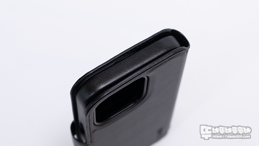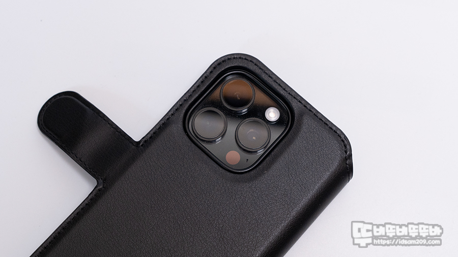 지갑 커버의 카메라 렌즈 부분 역시 케이스의 렌즈 보호 가이드와 정확히 일치하도록 디자인되어 있어, 부착 시 렌즈 가이드 위치를 따로 신경 쓰지 않아도 돼 사용 편의성이 뛰어납니다.