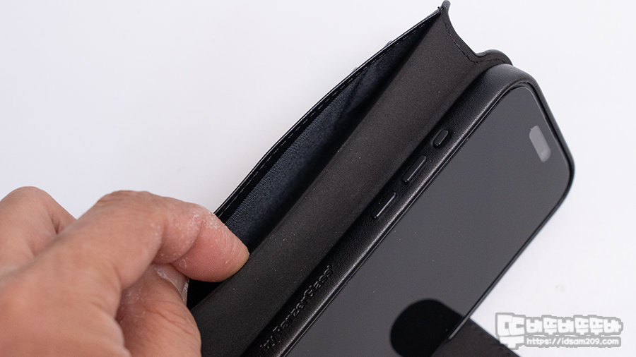 다만 카드를 넣은 상태에서 지갑 커버를 닫을 경우, 카드 엣지 부분이 스마트폰 화면에 닿을 수 있기 때문에 카드 수납은 가급적 적은 수로 유지하고, 가장 윗부분 슬롯부터 사용하는 것을 추천드립니다.