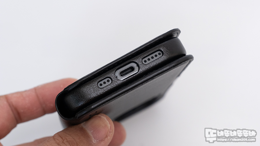 우선 하단의 충전 단자, 마이크, 스피커 부분은 정밀하게 타공되어 있어, USB-C 케이블을 연결할 때 다양한 몰딩 타입의 케이블도 문제없이 사용할 수 있을 정도의 여유 있는 설계되어 있고요.