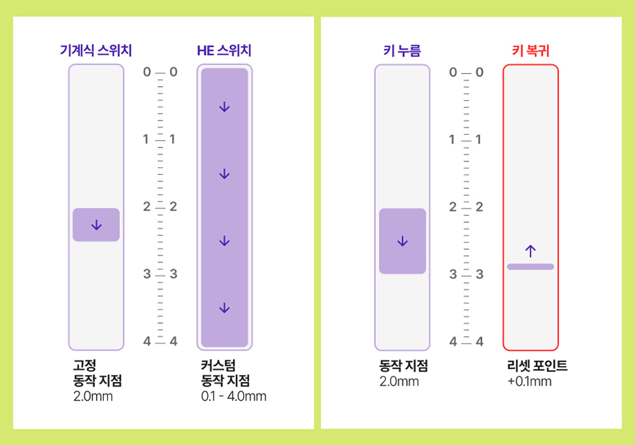 HE(Hall effect)를 지원하는 자석축의 경우 스위치가 가지고 있는 인식 깊이 0.1mm~4.0mm 깊이에서 사용자가 임의로 입력 지점과 해제 지점을 설정하여 빠르게 반응이 가능한 래피드 트리거를 지원하는데요.