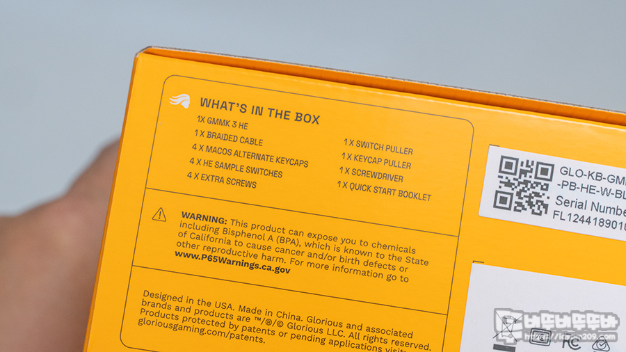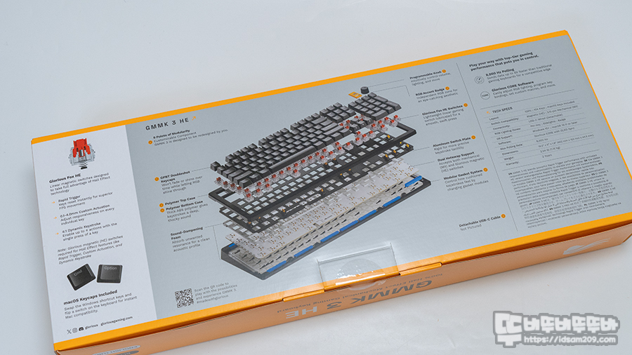패키지 뒷면에는 홀 이펙트(HE)를 지원하는 글로리어스 Fox HE 스위치, 래피드 트리거 지원, 0.1~4.0mm 입력 지점 지정, 한 개 키에 4가지 액션이 가능한 다이나믹 키 스트로크 그리고 Mac OS 키캡 동봉 그리고 키보드 내부에 촘촘하게 구성된 흡음재와 가스킷 댐퍼 모습, 8K 지원 및 코어 소프트웨어, 간단한 스펙 정보가 인쇄되어 있습니다.