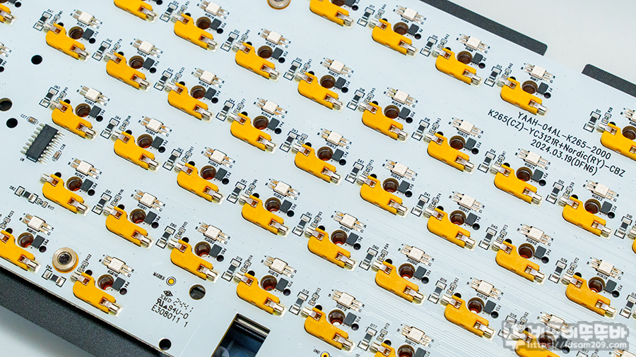 MX 스위치와 HE 스위치 혼용 기판을 사용하고 있어 기판 뒷면에는 MX 스위치 용 핫스왑 소켓을 확인할 수 있네요.