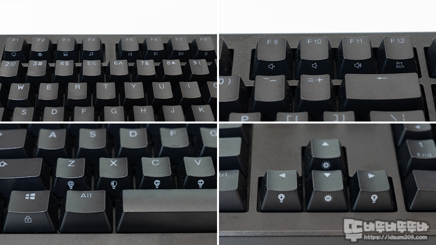 PBT 이중 사출 키캡이지만 기능 키 부분은 별도의 측각 각인으로 표현하고 있는데 윈도우 단축키 관련 기능과 멀티미디어 제어 기능은 F 펑션열, LED 관련 기능은 Z, X, C, V와 방향키에 기능을 포함하고 있습니다.