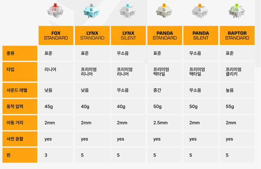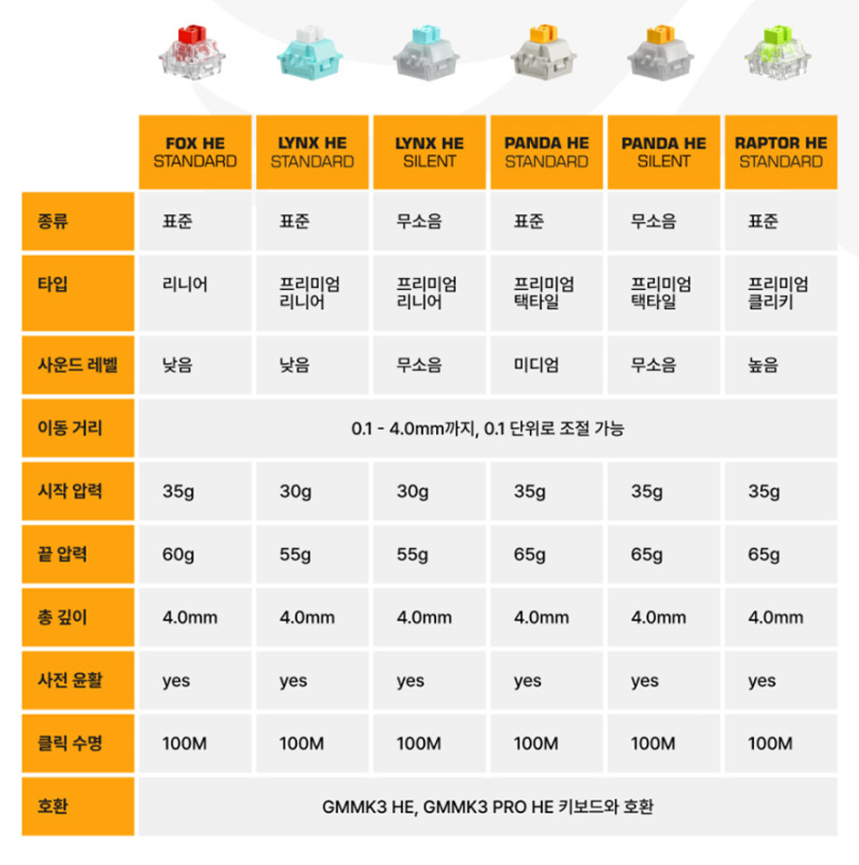 Glorious의 Hall effect (HE) 자석축의 특징은 Fox, Lynx, Lynx(저소음), 넌클릭 방식의 Panda, 크리고 클릭 방식의 Raptor 스위치 등 자사의 기계식 MX 스위치를 HE 스위치로 만들어 제공한다는 점인데 스위치 자체 기능은 다르지만 MX 스위치와 HE 스위치 느낌이 비슷하여 혼용으로 사용하더라도 비슷한 키감으로 사용이 가능하며 래피드 트리거가 필요한 키만 자석축을 사용할 수 있는 부분이 매력적입니다.