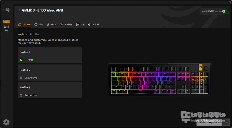 가장 처음에 위치한 내 키보드는 프로파일을 선택하는 메뉴지만 키보드 중앙에 프로파일 스위치와 연동되기도 하지만 스위치 모드와 상관없이 소프트웨어 선택도 가능하고요. Fn + R_Alt + ← / → 조합 키도 프로파일 전환이 가능하니 참고하세요.